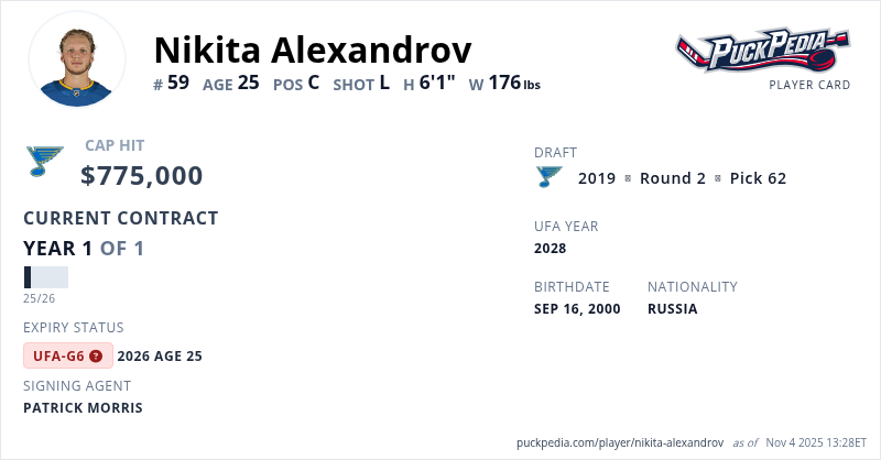 Nikita Alexandrov is signed to a 1 year, $775,000 contract with a cap hit of $775,000 per season, playing for the St. Louis Blues. His contract expires at the end of the 2025-26 season, making Alexandrov an Unrestricted Free Agent (Group 6).