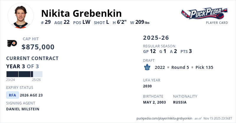 Nikita Grebenkin is signed to a 3 year, $2,625,000 contract with a cap hit of $875,000 per season, playing for the Philadelphia Flyers. His contract expires at the end of the 2025-26 season, making Grebenkin a Restricted Free Agent.