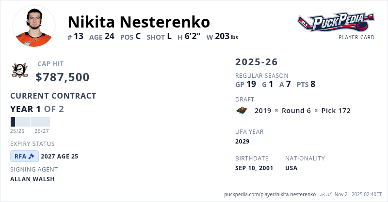 Nikita Nesterenko is signed to a 2 year, $1,575,000 contract with a cap hit of $787,500 per season, playing for the Anaheim Ducks. His contract expires at the end of the 2026-27 season, making Nesterenko a Restricted Free Agent.