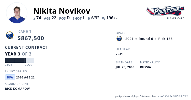 Nikita Novikov is signed to a 3 year, $2,602,500 contract with a cap hit of $867,500 per season, playing for the Buffalo Sabres. His contract expires at the end of the 2025-26 season, making Novikov a Restricted Free Agent.