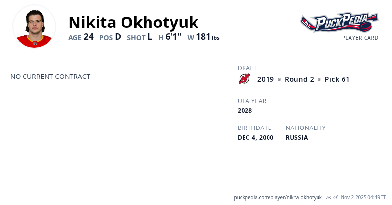 Nikita Okhotyuk is a Restricted Free Agent. His last contract was 3 years, $2,367,501 with a cap hit of $789,167 per season. It expired at the end of the 2023-24 season.