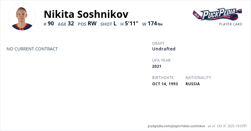 Nikita Soshnikov is an Unrestricted Free Agent. His last contract was 1 year, $750,000 with a cap hit of $750,000 per season. It expired at the end of the 2022-23 season.