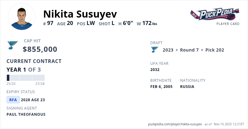 Nikita Susuyev is signed to a 3 year, $2,565,000 contract with a cap hit of $855,000 per season, playing for the St. Louis Blues. His contract expires at the end of the 2027-28 season, making Susuyev a Restricted Free Agent.