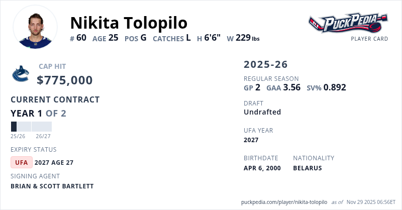 Nikita Tolopilo is signed to a 2 year, $1,550,000 contract with a cap hit of $775,000 per season, playing for the Vancouver Canucks. His contract expires at the end of the 2026-27 season, making Tolopilo an Unrestricted Free Agent.