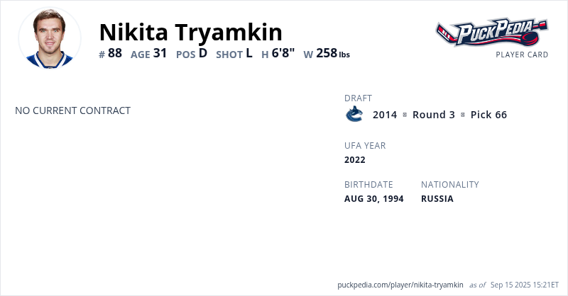 Nikita Tryamkin is a Restricted Free Agent. His last contract was 2 years, $1,850,000 with a cap hit of $925,000 per season. It expired at the end of the 2016-17 season.
