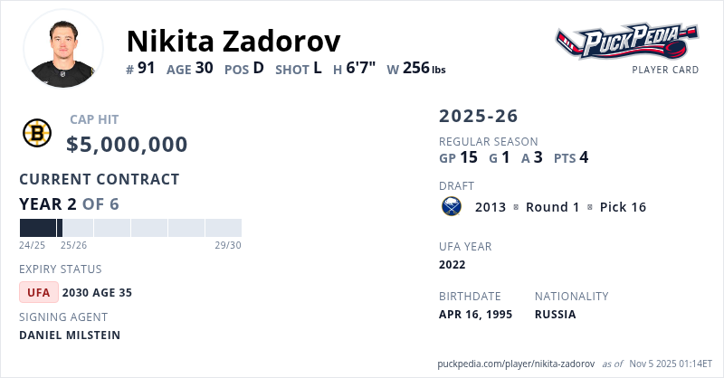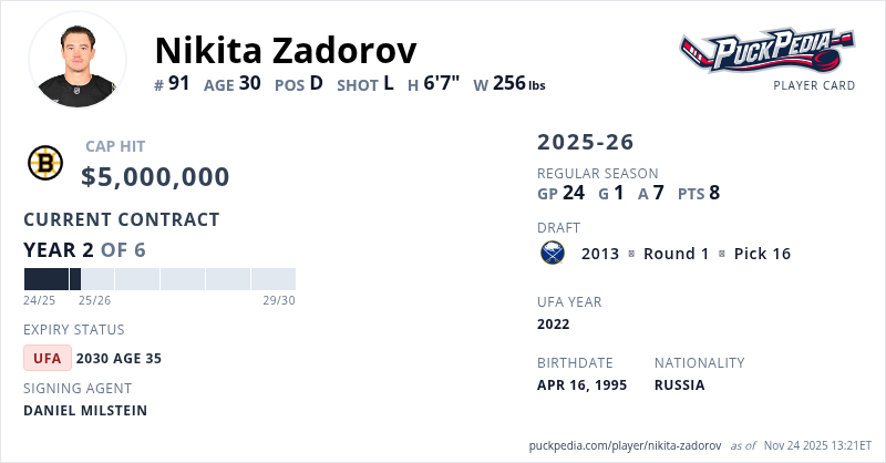 Nikita Zadorov is signed to a 6 year, $30,000,000 contract with a cap hit of $5,000,000 per season, playing for the Boston Bruins. His contract expires at the end of the 2029-30 season, making Zadorov an Unrestricted Free Agent.