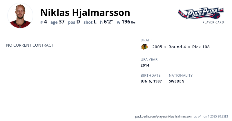 Niklas Hjalmarsson is an Unrestricted Free Agent. His last contract was 2 years, $10,000,000 with a cap hit of $5,000,000 per season. It expired at the end of the 2020-21 season.