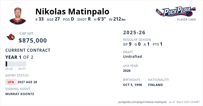 Nikolas Matinpalo is signed to a 2 year, $1,750,000 contract with a cap hit of $875,000 per season, playing for the Ottawa Senators. His contract expires at the end of the 2026-27 season, making Matinpalo an Unrestricted Free Agent.