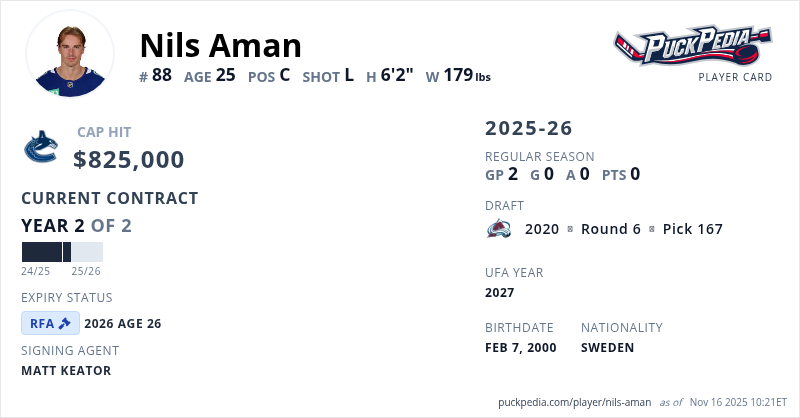 Nils Aman is signed to a 2 year, $1,650,000 contract with a cap hit of $825,000 per season, playing for the Vancouver Canucks. His contract expires at the end of the 2025-26 season, making Aman a Restricted Free Agent.