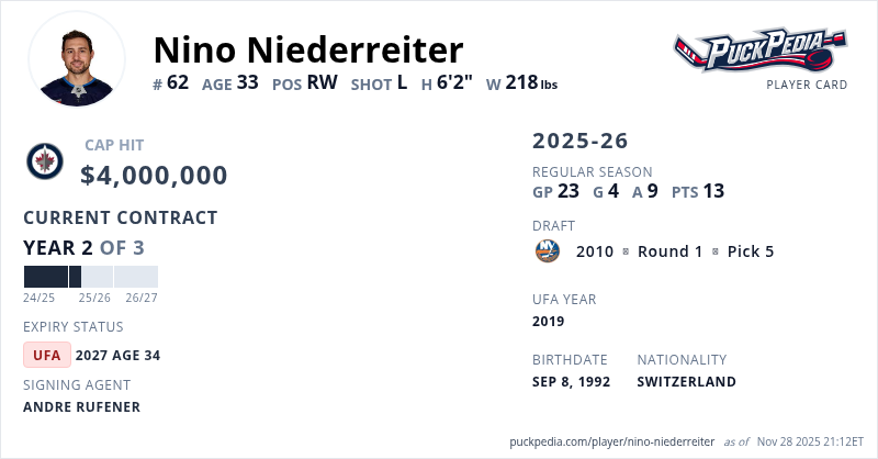 Nino Niederreiter is signed to a 3 year, $12,000,000 contract with a cap hit of $4,000,000 per season, playing for the Winnipeg Jets. His contract expires at the end of the 2026-27 season, making Niederreiter an Unrestricted Free Agent.