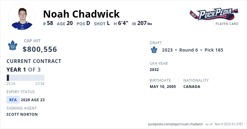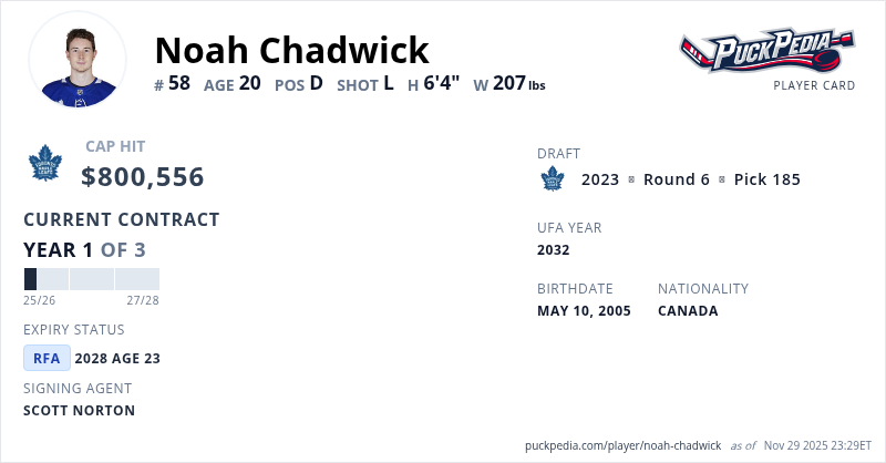 Noah Chadwick is signed to a 3 year, $2,401,668 contract with a cap hit of $800,556 per season, playing for the Toronto Maple Leafs. His contract expires at the end of the 2027-28 season, making Chadwick a Restricted Free Agent.
