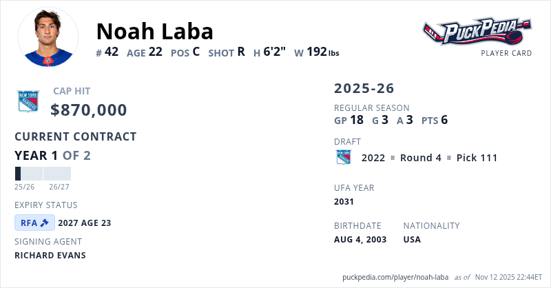Noah Laba is signed to a 2 year, $1,740,000 contract with a cap hit of $870,000 per season, playing for the New York Rangers. His contract expires at the end of the 2026-27 season, making Laba a Restricted Free Agent.