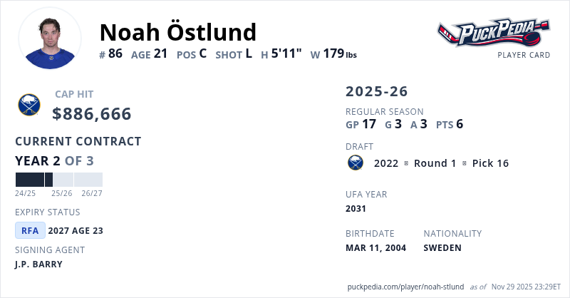 Noah Östlund is signed to a 3 year, $2,659,998 contract with a cap hit of $886,666 per season, playing for the Buffalo Sabres. His contract expires at the end of the 2026-27 season, making Östlund a Restricted Free Agent.