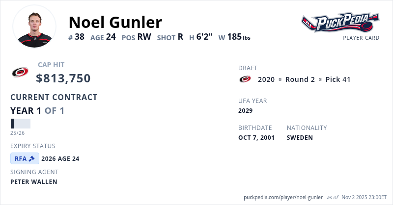 Noel Gunler is signed to a 1 year, $813,750 contract with a cap hit of $813,750 per season, playing for the Carolina Hurricanes. His contract expires at the end of the 2025-26 season, making Gunler a Restricted Free Agent.