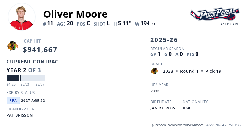 Oliver Moore is signed to a 3 year, $2,825,001 contract with a cap hit of $941,667 per season, playing for the Chicago Blackhawks. His contract expires at the end of the 2026-27 season, making Moore a Restricted Free Agent.