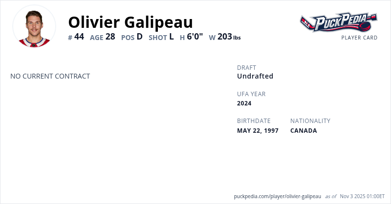 | 2022-23 | 25 | AHL | Laval Rocket | 45 | 3 | 6 | 9 | 42 | Playoffs | 2 | 0 | 0 | 0 | 0 | ||||||||||||||||