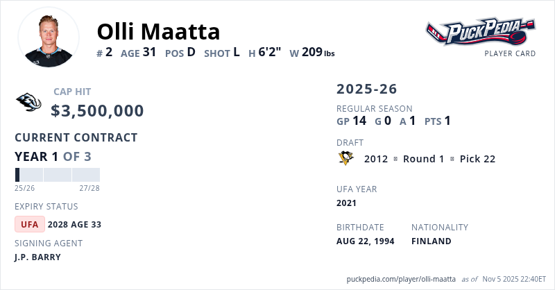 Olli Maatta is signed to a 3 year, $10,500,000 contract with a cap hit of $3,500,000 per season, playing for the Utah Mammoth. His contract expires at the end of the 2027-28 season, making Maatta an Unrestricted Free Agent.