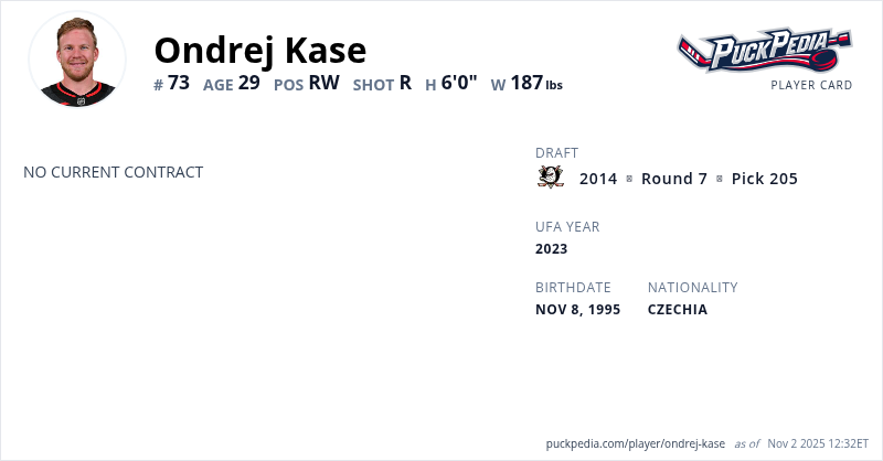 Ondrej Kase is an Unrestricted Free Agent. His last contract was 1 year, $1,500,000 with a cap hit of $1,500,000 per season. It expired at the end of the 2022-23 season.