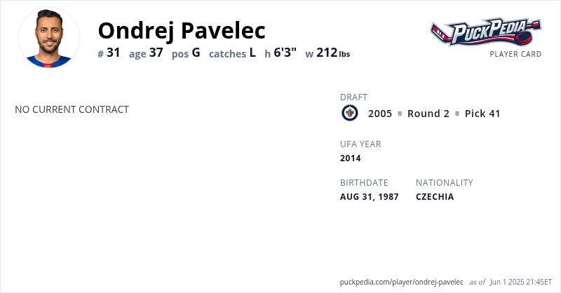 Ondrej Pavelec is an Unrestricted Free Agent. His last contract was 1 year, $1,300,000 with a cap hit of $1,300,000 per season. It expired at the end of the 2017-18 season.