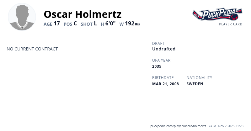| 2025-26 | 17 | International-Jr | Sweden U18 (all) | 6 | 2 | 6 | 8 | 0 | ||||||||||||||||||||||