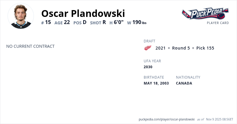 | 2021-22 | 18 | QMJHL | Charlottetown Islanders | 64 | 4 | 13 | 17 | 39 | Playoffs | 15 | 1 | 0 | 1 | 0 | ||||||||||||||||