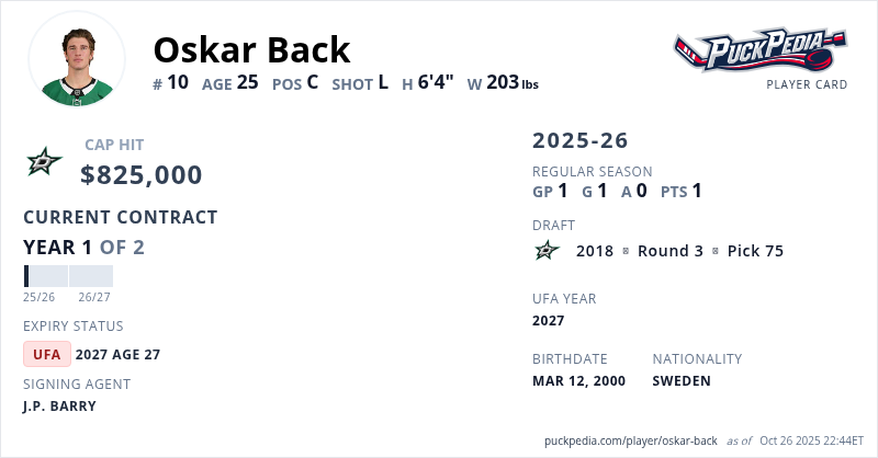 Oskar Back is signed to a 2 year, $1,650,000 contract with a cap hit of $825,000 per season, playing for the Dallas Stars. His contract expires at the end of the 2026-27 season, making Back an Unrestricted Free Agent.