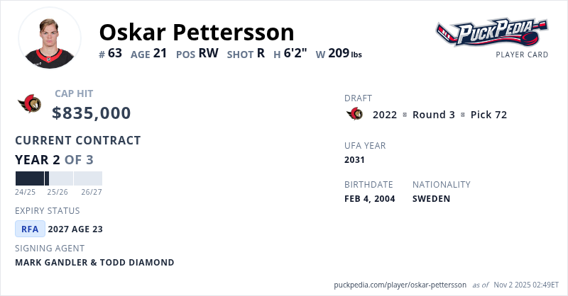 Oskar Pettersson is signed to a 3 year, $2,505,000 contract with a cap hit of $835,000 per season, playing for the Ottawa Senators. His contract expires at the end of the 2026-27 season, making Pettersson a Restricted Free Agent.