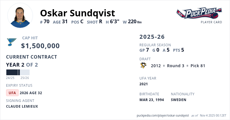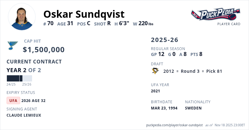 Oskar Sundqvist is signed to a 2 year, $3,000,000 contract with a cap hit of $1,500,000 per season, playing for the St. Louis Blues. His contract expires at the end of the 2025-26 season, making Sundqvist an Unrestricted Free Agent.