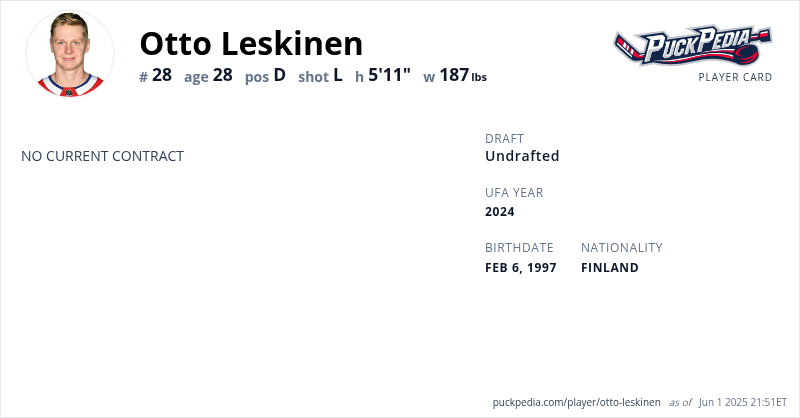 Otto Leskinen is an Unrestricted Free Agent (Group 6). His last contract was 1 year, $750,000 with a cap hit of $750,000 per season. It expired at the end of the 2022-23 season.