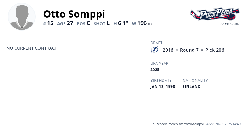 Otto Somppi is an Unrestricted Free Agent (No Qualifying Offer). His last contract was 1 year, $750,000 with a cap hit of $750,000 per season. It expired at the end of the 2021-22 season.