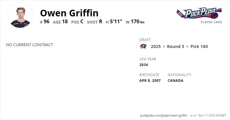 | 2024-25 | 17 | OHL | Oshawa Generals | 62 | 22 | 29 | 51 | 33 | Playoffs | 21 | 16 | 13 | 29 | 0 | ||||||||||||||||