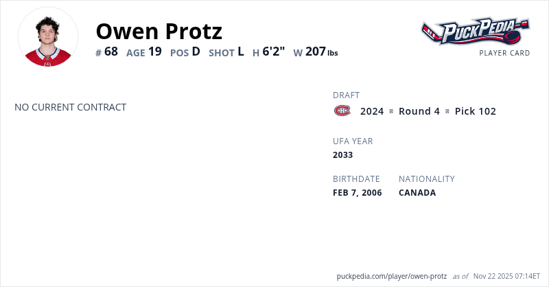 | 2025-26 | 19 | OHL | Brantford Bulldogs | 21 | 2 | 9 | 11 | 14 | ||||||||||||||||||||||