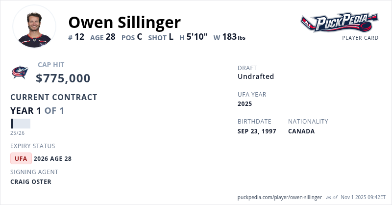 Owen Sillinger is signed to a 1 year, $775,000 contract with a cap hit of $775,000 per season, playing for the Columbus Blue Jackets. His contract expires at the end of the 2025-26 season, making Sillinger an Unrestricted Free Agent.