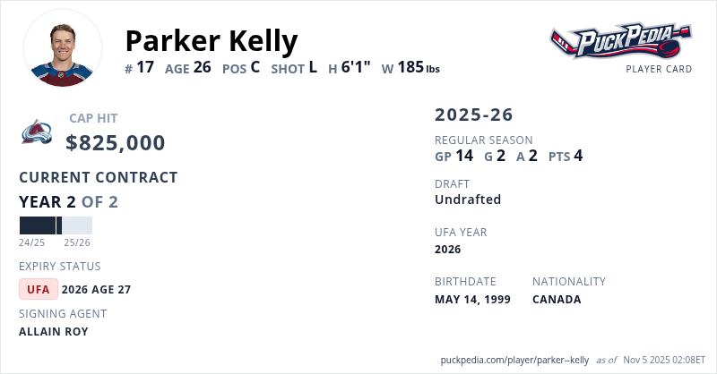 Parker Kelly is signed to a 4 year, $6,800,000 contract extension with a cap hit of $1,700,000 per season. He plays for the Colorado Avalanche. His next contract begins for the 2026-27 season and expires at the end of the 2029-30 season, making him an Unrestricted Free Agent.