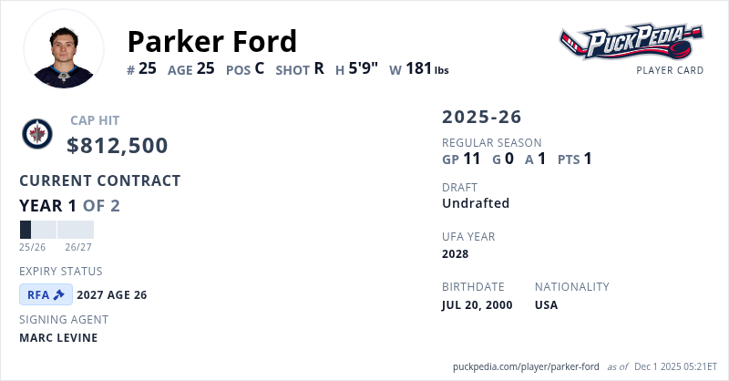 Parker Ford is signed to a 2 year, $1,625,000 contract with a cap hit of $812,500 per season, playing for the Winnipeg Jets. His contract expires at the end of the 2026-27 season, making Ford a Restricted Free Agent.