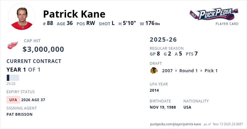 Patrick Kane is signed to a 1 year, $3,000,000 contract with a cap hit of $3,000,000 per season, playing for the Detroit Red Wings. His contract expires at the end of the 2025-26 season, making Kane an Unrestricted Free Agent.