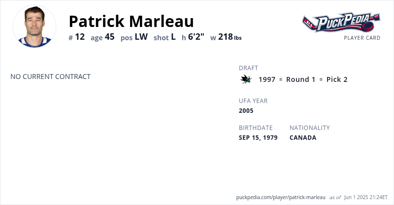 Patrick Marleau is an Unrestricted Free Agent. His last contract was 1 year, $700,000 with a cap hit of $700,000 per season. It expired at the end of the 2020-21 season.