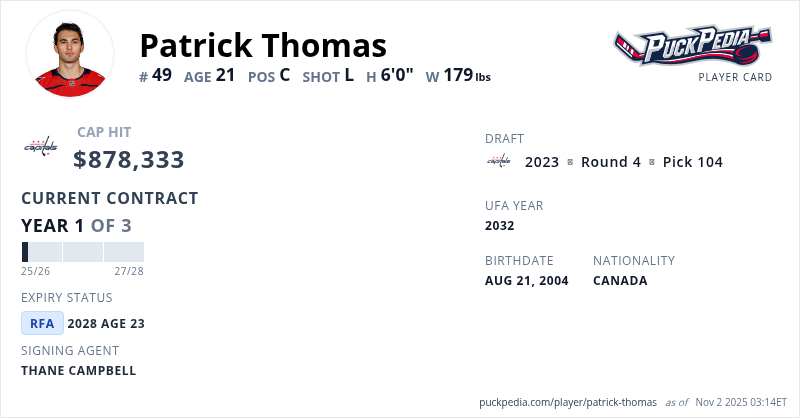 Patrick Thomas is signed to a 3 year, $2,634,999 contract with a cap hit of $878,333 per season, playing for the Washington Capitals. His contract expires at the end of the 2027-28 season, making Thomas a Restricted Free Agent.