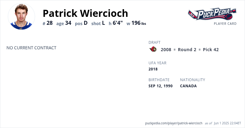 Patrick Wiercioch is an Unrestricted Free Agent. His last contract was 1 year, $650,000 with a cap hit of $650,000 per season. It expired at the end of the 2017-18 season.