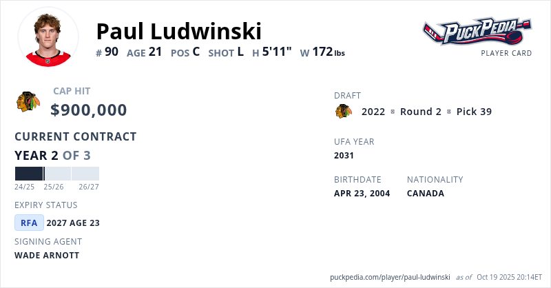 Paul Ludwinski is signed to a 3 year, $2,700,000 contract with a cap hit of $900,000 per season, playing for the Chicago Blackhawks. His contract expires at the end of the 2026-27 season, making Ludwinski a Restricted Free Agent.