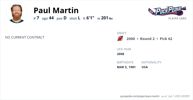 Paul Martin is an Unrestricted Free Agent. His last contract was 4 years, $19,400,000 with a cap hit of $4,850,000 per season. It expired at the end of the 2018-19 season.