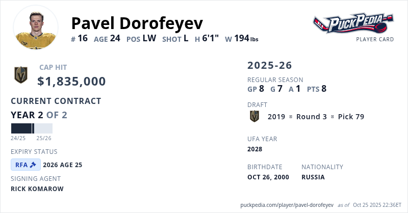 Pavel Dorofeyev is signed to a 2 year, $3,670,000 contract with a cap hit of $1,835,000 per season, playing for the Vegas Golden Knights. His contract expires at the end of the 2025-26 season, making Dorofeyev a Restricted Free Agent.