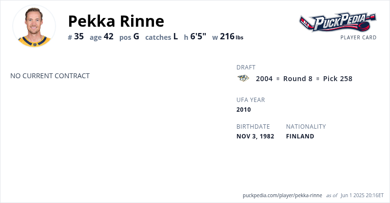 Pekka Rinne is an Unrestricted Free Agent. His last contract was 2 years, $10,000,000 with a cap hit of $5,000,000 per season. It expired at the end of the 2020-21 season.