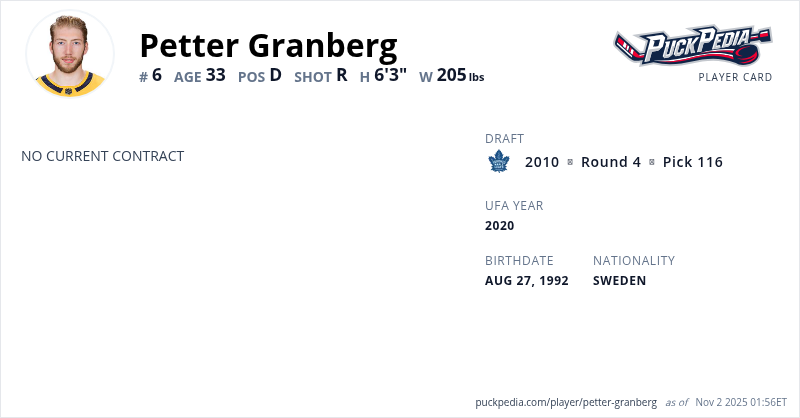 Petter Granberg is an Unrestricted Free Agent (No Qualifying Offer). His last contract was 2 years, $1,225,000 with a cap hit of $612,500 per season. It expired at the end of the 2017-18 season.