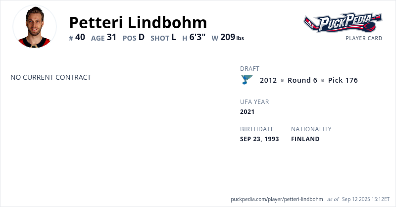 Petteri Lindbohm is an Unrestricted Free Agent. His last contract was 1 year, $750,000 with a cap hit of $750,000 per season. It expired at the end of the 2021-22 season.