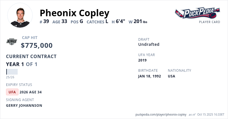 Pheonix Copley is signed to a 1 year, $775,000 contract with a cap hit of $775,000 per season, playing for the Los Angeles Kings. His contract expires at the end of the 2025-26 season, making Copley an Unrestricted Free Agent.