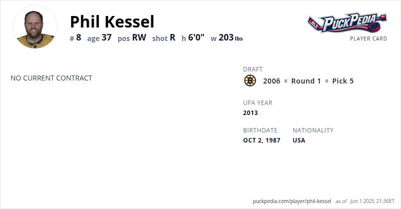 Phil Kessel is an Unrestricted Free Agent. His last contract was 1 year, $1,500,000 with a cap hit of $1,500,000 per season. It expired at the end of the 2022-23 season.