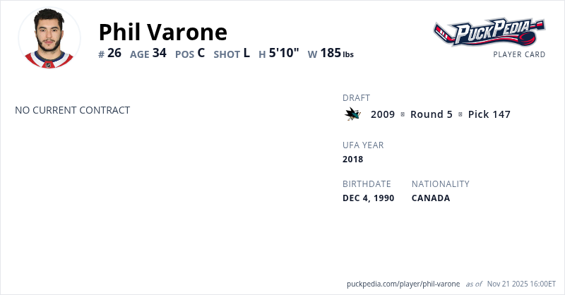 Phil Varone is an Unrestricted Free Agent. His last contract was 1 year, $700,000 with a cap hit of $700,000 per season. It expired at the end of the 2019-20 season.