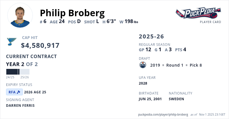Philip Broberg is signed to a 2 year, $9,161,834 contract with a cap hit of $4,580,917 per season, playing for the St. Louis Blues. His contract expires at the end of the 2025-26 season, making Broberg a Restricted Free Agent.