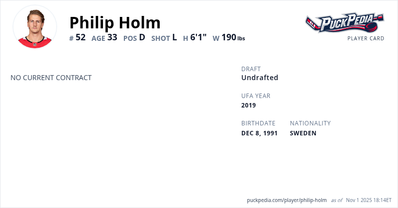 Philip Holm is an Unrestricted Free Agent. His last contract was 1 year, $700,000 with a cap hit of $700,000 per season. It expired at the end of the 2019-20 season.